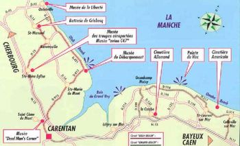 Carentan se trouve dans le secteur américain du Débarquement. De Carentan vous pouvez vous rendre sur la plage d'Utah-Beach à 15 km, en passant par Saint Côme du Mont et visitez le Dead Man's Corner Museum, puis Sainte-Marie-du-Mont, puis monter jusqu'aux Batteries de Crisbecq et Azeville, près de Saint-Marcouf au dessus de Ravenoville et revenir par Sainte-Mère-Eglise où vous pourrez visiter les deux musées " Troupe aéroportée " et " Avion C 47 ". Ou bien vous pouvez partir sur la Pointe du Hoc en passant Grandcamp-Maisy. Puis visitez le cimetière de Colleville-Saint-Laurent près de la plage d’Omaha-Beach. Vous passerez alors devant le cimetière allemand de la " cambe ".